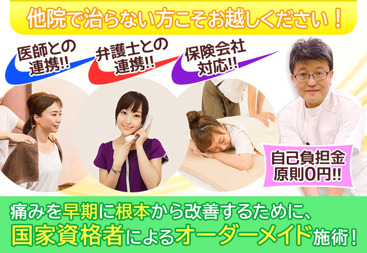三和整骨院は、後遺症に大変詳しい「弁護士法人心」さんの指導を受けておりますので、保険会社対応も万全です。